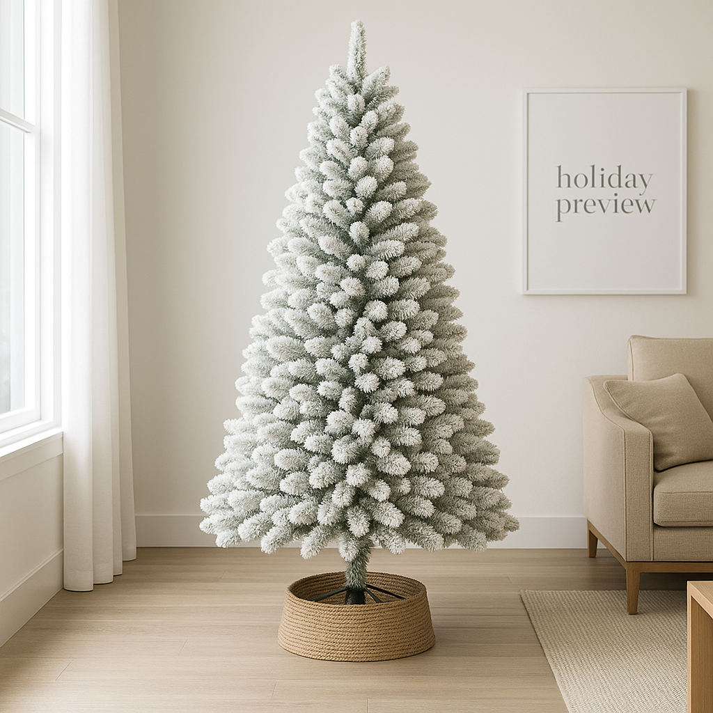 A estrutura firme com base metálica oferece segurança e estabilidade, enquanto os galhos bem distribuídos permitem uma decoração robusta com enfeites, laços e luzes. O acabamento nevado traz um ar sofisticado e acolhedor, valorizando a experiência do consumidor.