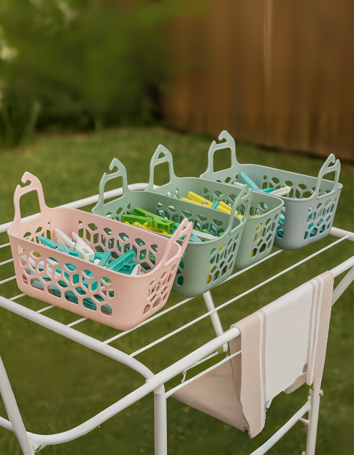 Mais do que um simples cestinho, ele ajuda a manter a lavanderia prática e sem bagunça, deixando os pregadores sempre à mão e prontos para o uso.