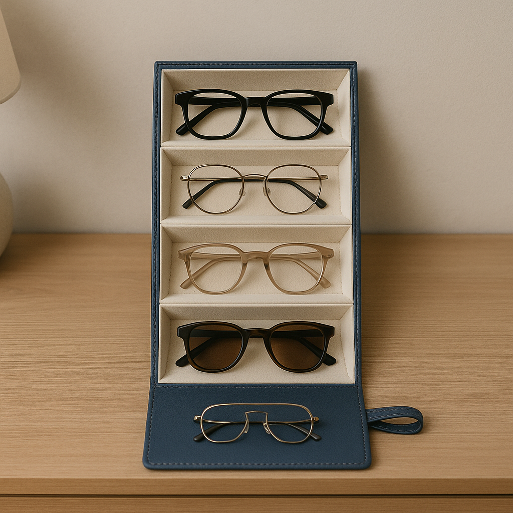 Com design moderno e acabamento sofisticado, ele armazena até cinco pares de óculos de forma segura e organizada, sem riscos de arranhões ou danos.
