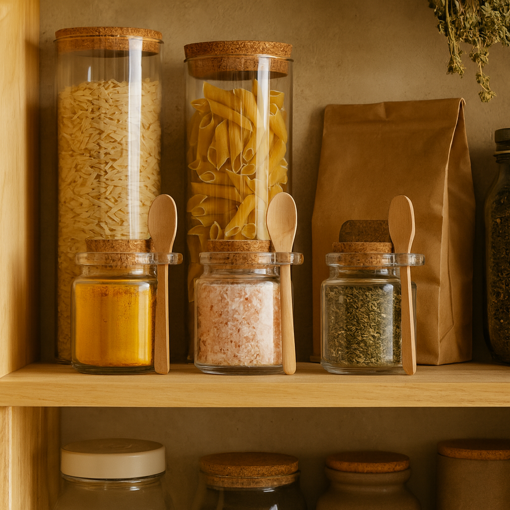 O Kit 3 Potes de Vidro com Colher de Bambu e Tampa de Rolha é o conjunto perfeito para quem busca organização e charme natural na cozinha.