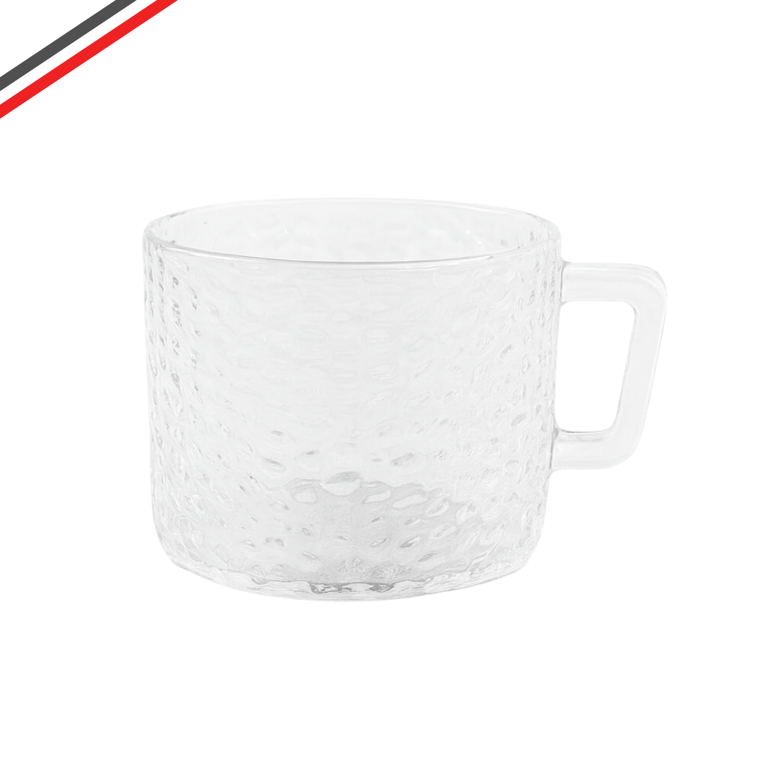 Xícara de vidro com design sofisticado e acabamento texturizado, ideal para servir café, chá ou outras bebidas quentes e frias.